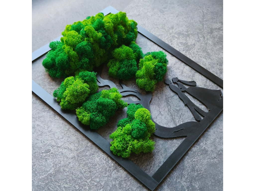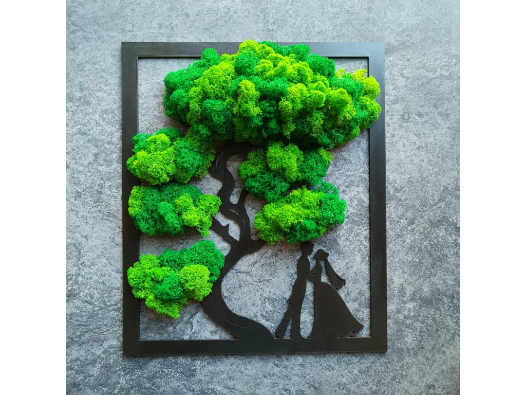 V strede obrazu stojí strom bonsai – symbol dlhovekosti, harmónie a vytrvalosti. Pod jeho rozložitou korunou z prírodného machu vidno zamilovaný pár, ktorý sa nežne objíma. Jemný, no silný emocionálny odkaz – ideálny na svadbu, výročie alebo ako oslava novej životnej cesty.